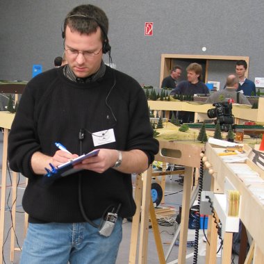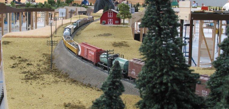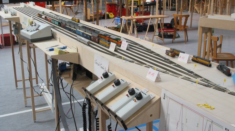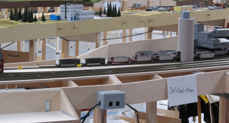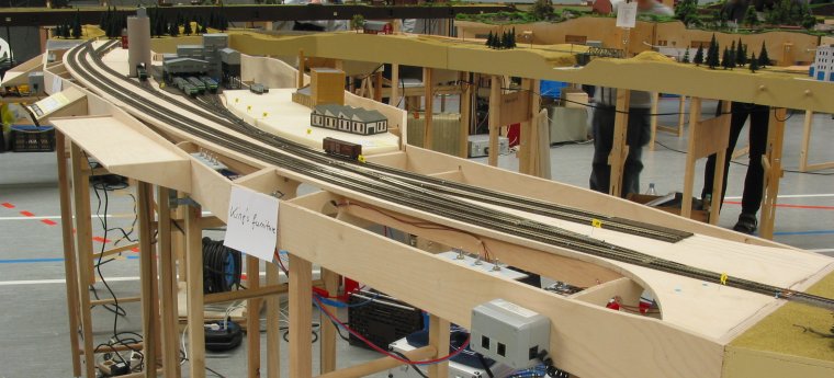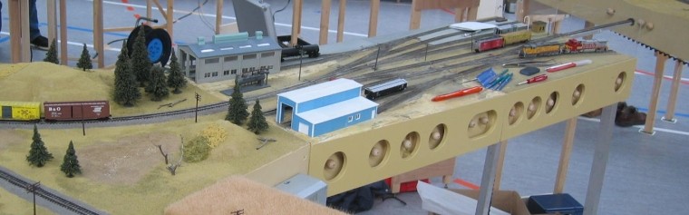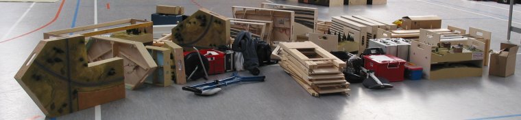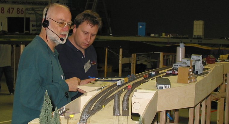 Zum FREMO-Jahrestreffen 2005 in Hochdorf gab es bei americaN viel Neues: Ein zweiter Schattenbahnhof ist nun ebenso einsatzbereit wie eine weitere große Betriebsstelle. Da wir nun die Loop-Konfiguration aufgeben konnten, wurde Sand Pit Junction als Interchange bedient. Am Freitag und Samstag war an diesem Abzweig Watkins angebaut, danach halfen uns die N-RE-Kollegen mit dem Schattenbahnhof Boxenem aus. Möge der Aufbau beginnen... Das Ganze geordnet und aus der Vogelperspektive. Auch bezüglich der Betriebsführung gab es Neues: Die Zugbewegungen wurden mittels Track Warrant Control koordiniert und gesichert.
