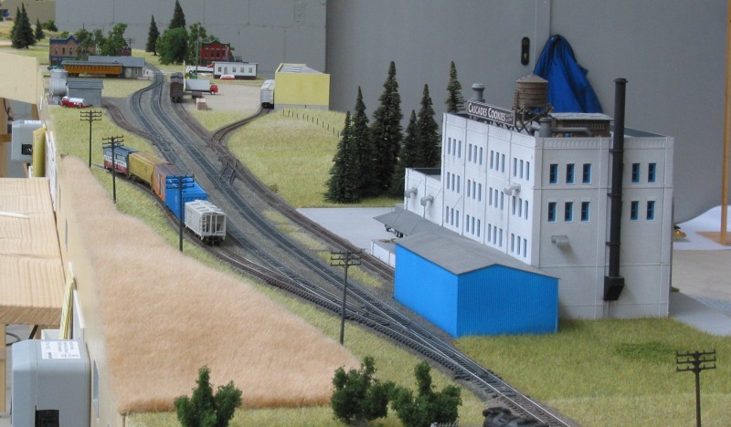 die GN-Strecke schon zurückgebaut. Größter Anschließer der UP ist die Keksfabrik CASCADES COOKIES. Eingehende Wagen liefern die benötigten Speisefette und den Zucker an. Letzterer wird in einen Tiefbunker unter dem “Wellblechanbau” entladen. Während das Weizenmehl per Lkw aus der Umgebung angeliefert wird, erreichen die Verpackungskartonagen das Werk auf der Schiene. Der Großteil der Produktion wird auch wieder über die Schiene abtransportiert. Innerhalb des fiktiven
